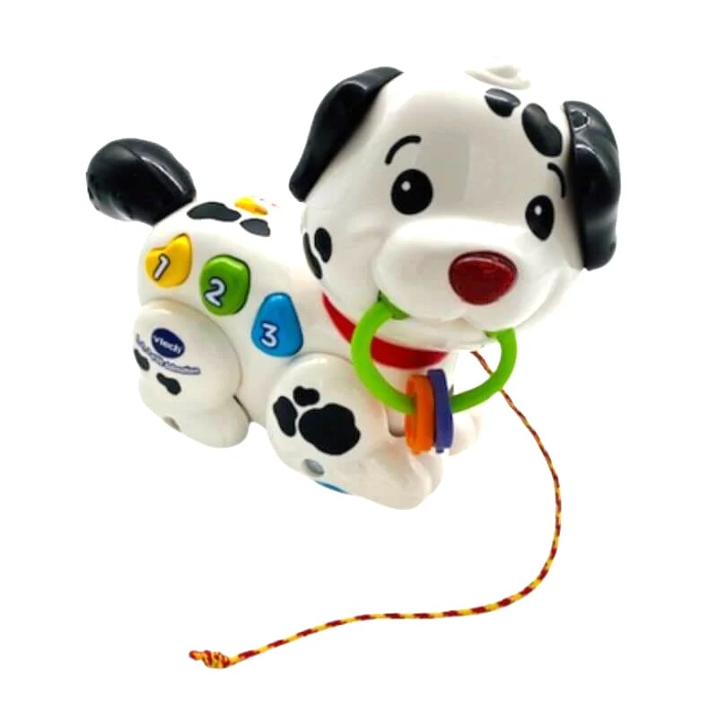 Petit Dalmatien de la marque VTECH Petit chien interactif à tirer et qui chante Son nez clignote au rythme des mélodies ! 3 mélodies et 20 chansons État et Options incluses En parfait état Piles incluses