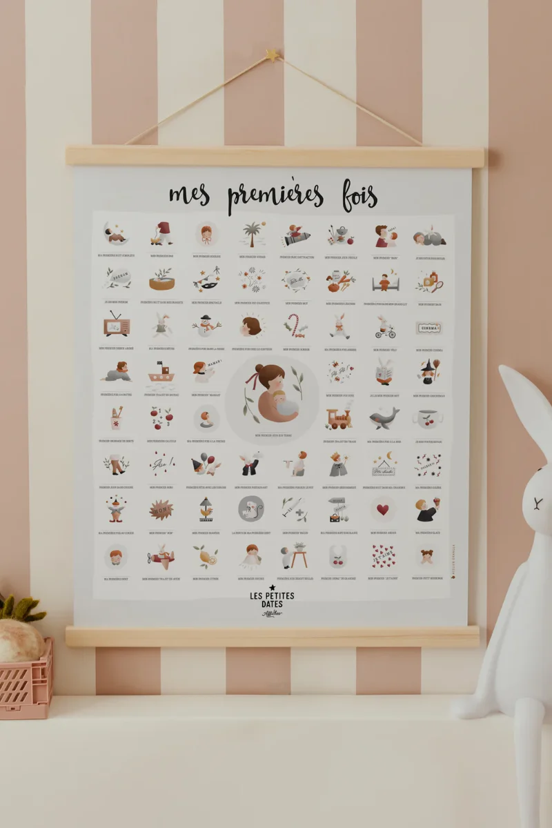 Il y a les premières fois qu’on n’oublie pas comme les premiers pas, le premier mot… et il y a toutes les autres ! Qui se rappelle de la date de son premier bobo, de son premier brossage de dent, de sa première bêtise… ? Entre le « premier jour sur terre » et « mon premier trajet en avion »… L’affiche comprend 61 premières fois pour accompagner la vie d’un enfant de 0 à 7 ans ou plus !