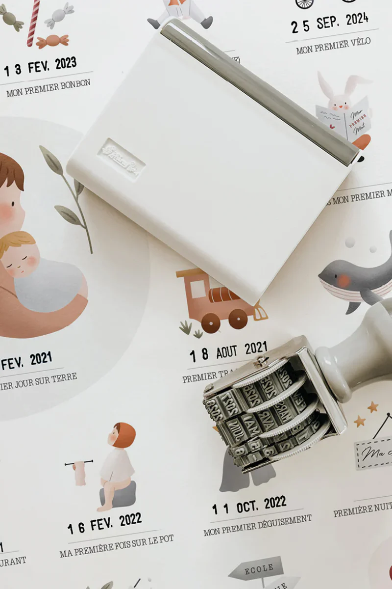 Un tampon, un dateur et l’affiche sont livrés dans une jolie boite pour faire un joli cadeau de naissance.