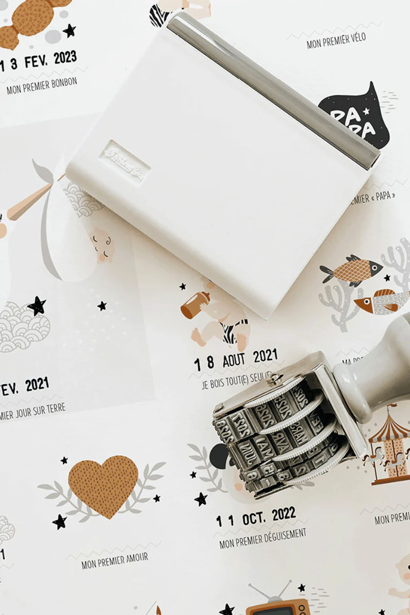L’ensemble comprend une affiche, un dateur et un tampon encreur pour un cadeau de naissance idéal et personnalisable !