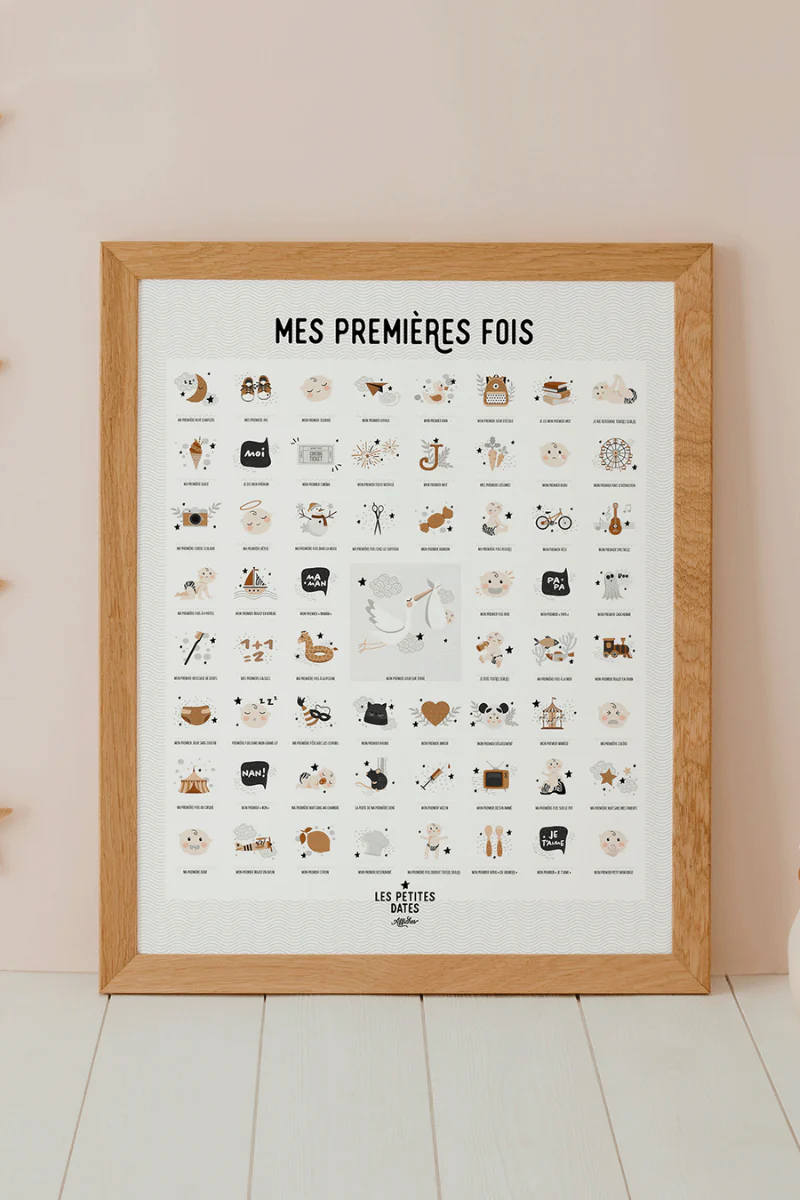 L’affiche Mes premières fois comprend 61 premières fois pour accompagner la vie d’un enfant de 0 à 7 ans. Il est vrai qu’il y a des premières fois marquantes mais il y a celles qu’on oublie. Cette affiche mes premières fois vous laissera des souvenirs pour toujours. Entre la date de son premier bobo, de son premier brossage de dent, de sa première bêtise ou de son premier trajet en avion, cette affiche retracera tout le parcours de votre enfant.