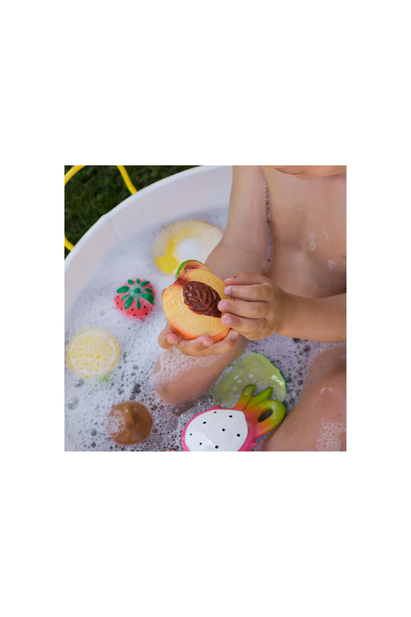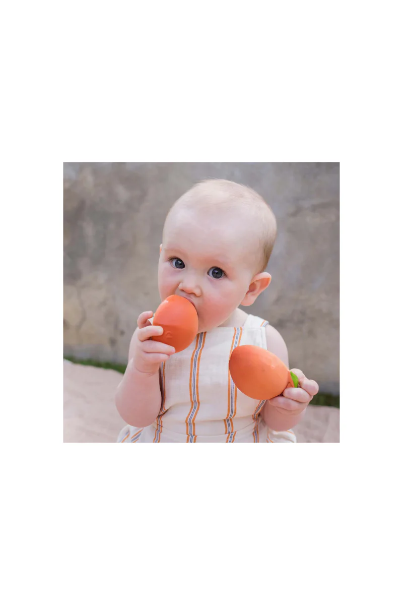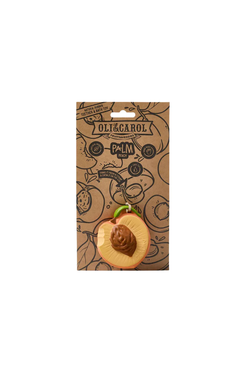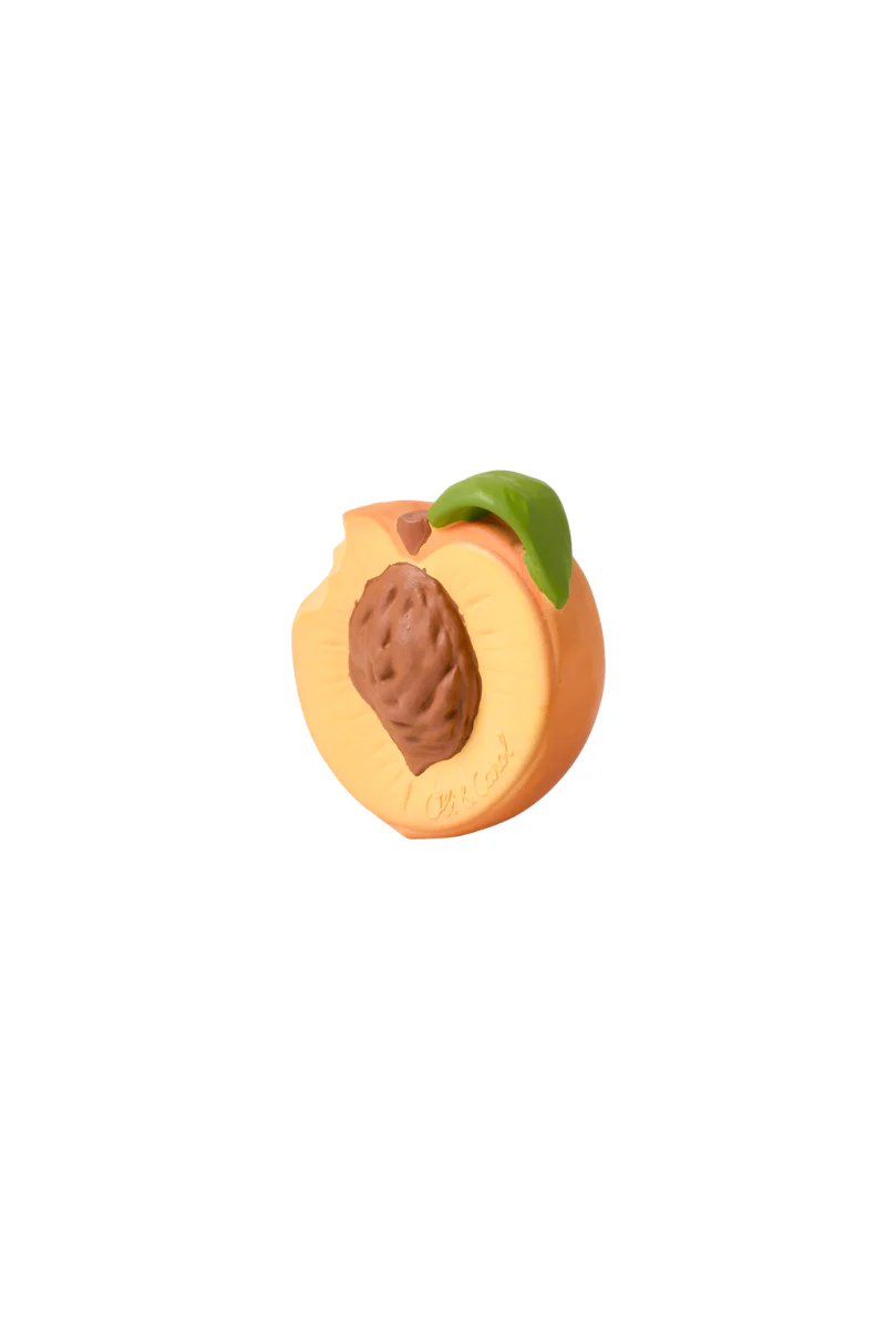 Anneau de dentition en forme de pêche de la marque Oli&Carol stimule les sens de bébé tout en apaisant les petites gencives. Ses textures réalistes développent le sens du toucher des enfants.