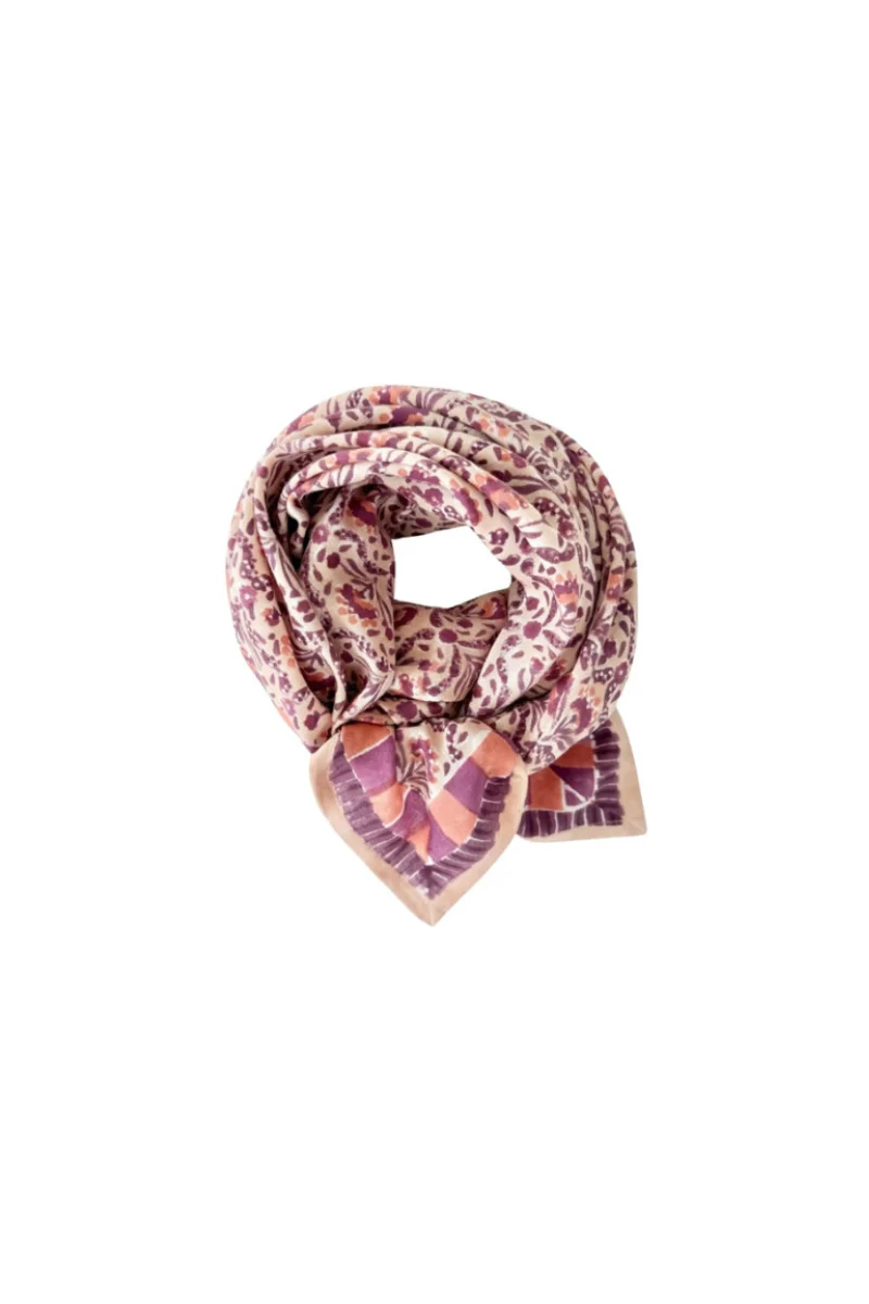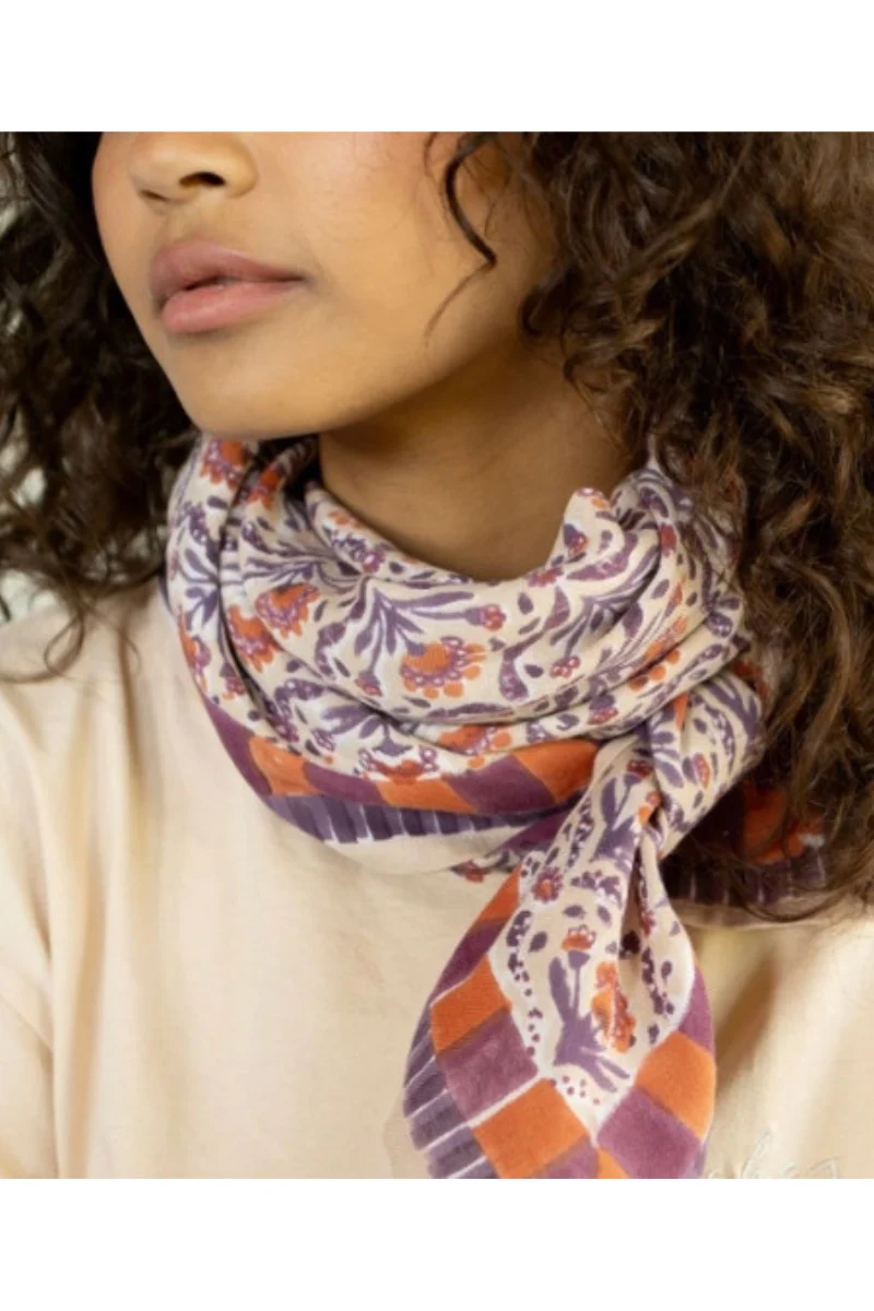 En 100% coton, chaque foulard est confectionné artisanalement grâce à la technique indienne du block-print, ses couleurs sont réalisées à partir de pigments naturels. Cette confection manuelle peut entraîner certaines « irrégularités ».