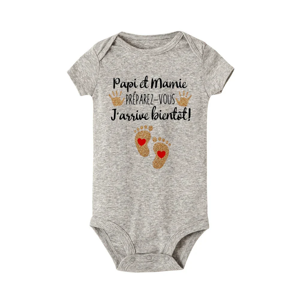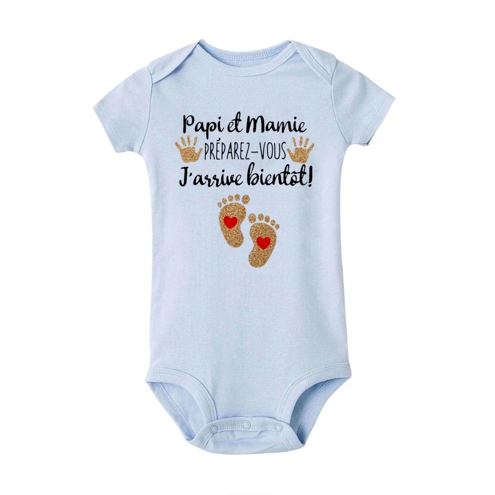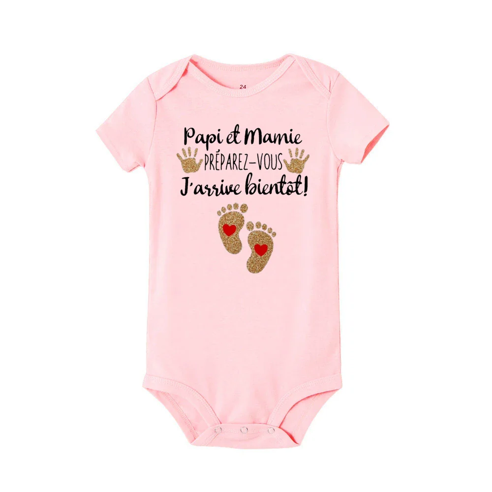 Ce body imprimé « Papi et Mamie, préparez-vous… j’arrive bientôt ! » est le choix parfait pour révéler l’arrivée de bébé avec tendresse et originalité. Une surprise pleine d’émotion à offrir pour marquer ce moment unique.