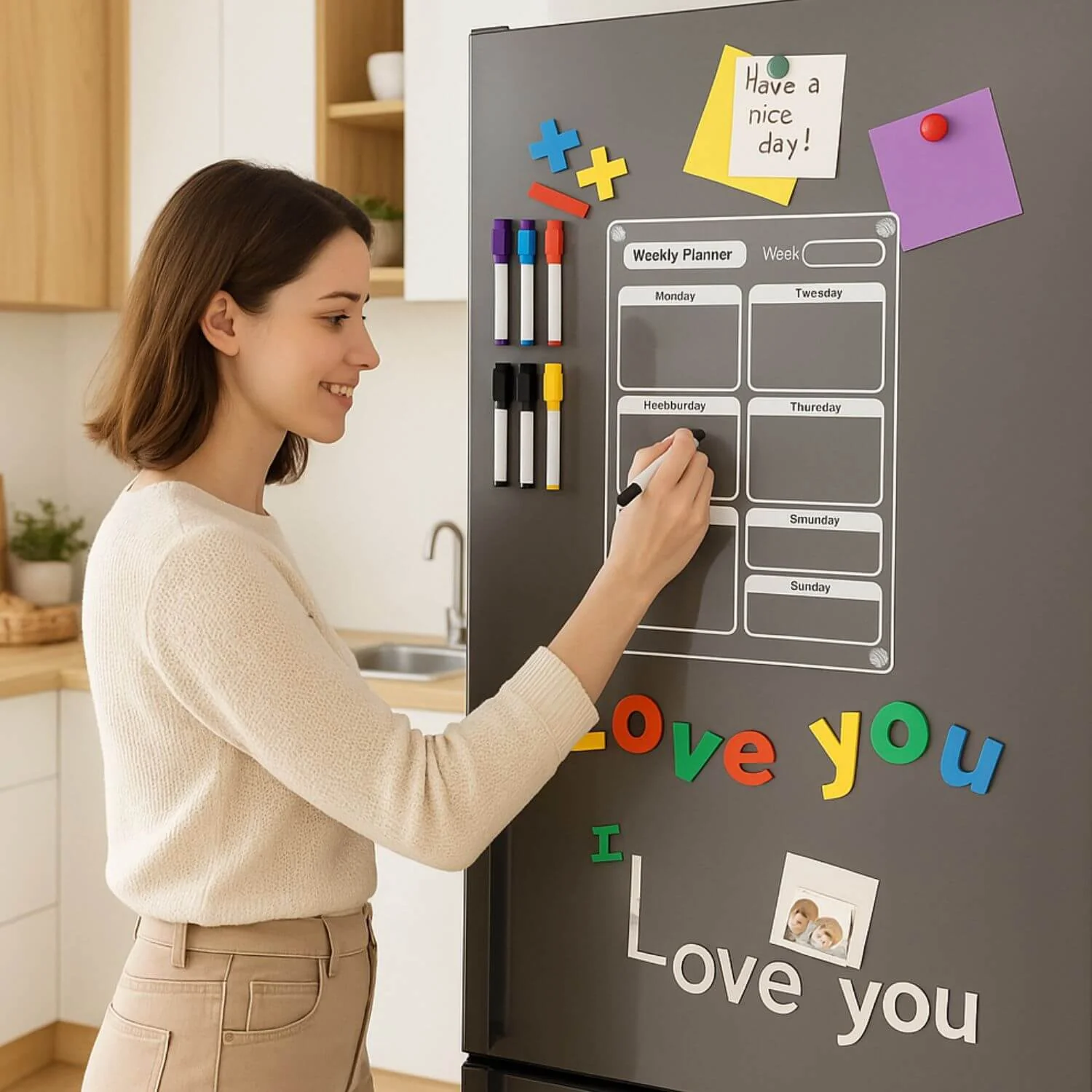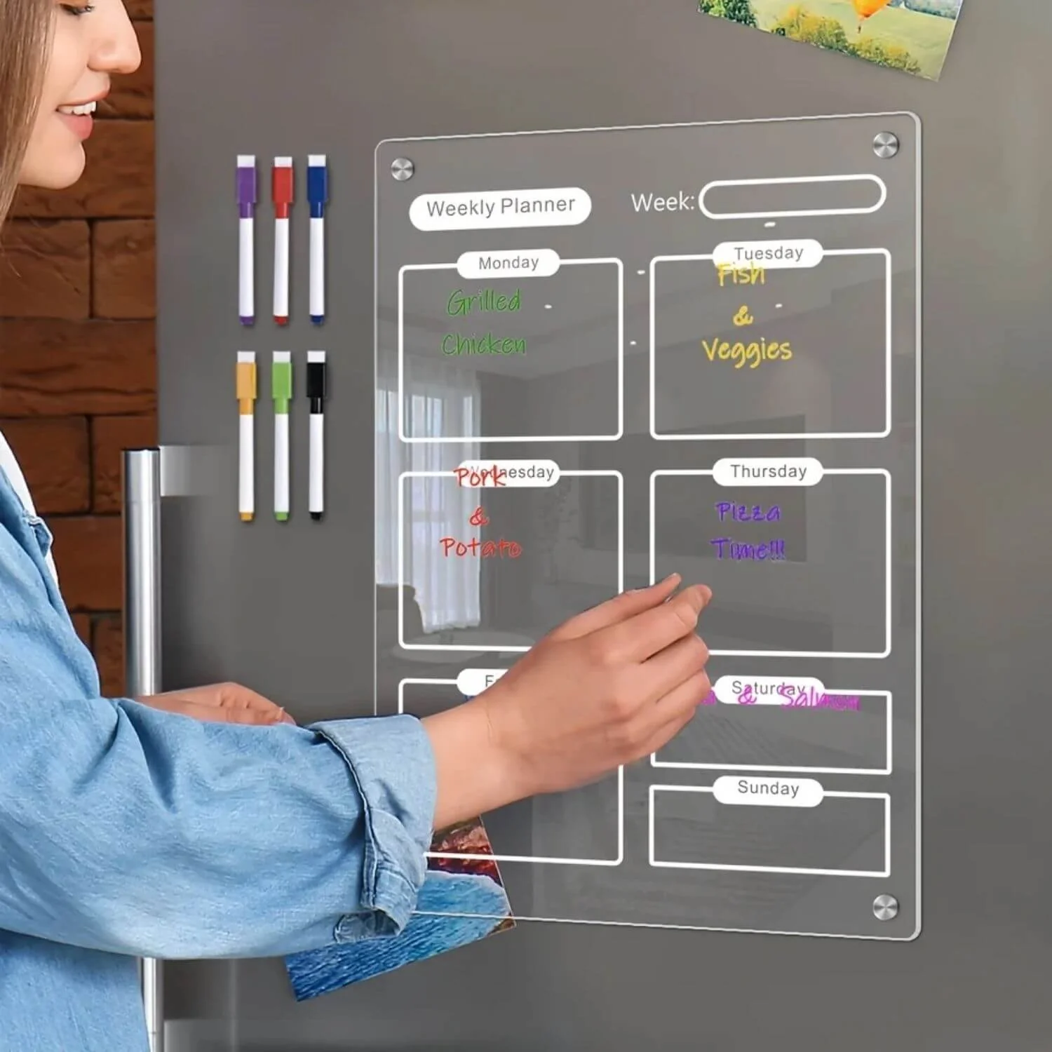 Le semainier, avec sa surface effaçable à sec de 20×30 cm, s’intègre parfaitement dans votre cuisine grâce à son support magnétique.