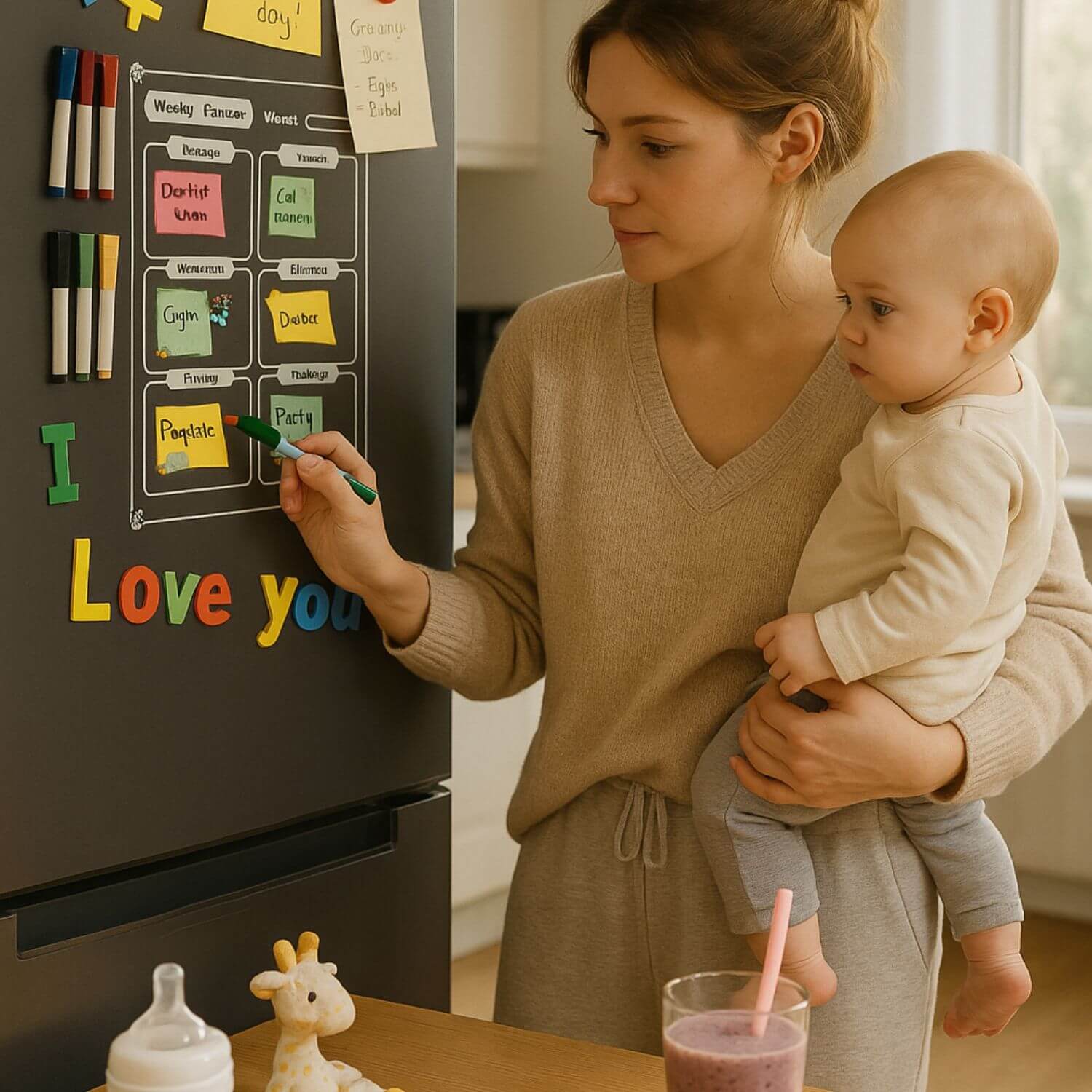 Le Cadeau jeune maman SanStress™ arrive comme une bouffée d’air frais dans ce quotidien surchargé. Ce semainier magnétique transparent est bien plus qu’un simple planificateur – c’est un allié précieux qui libère l’esprit et apporte clarté dans le chaos.