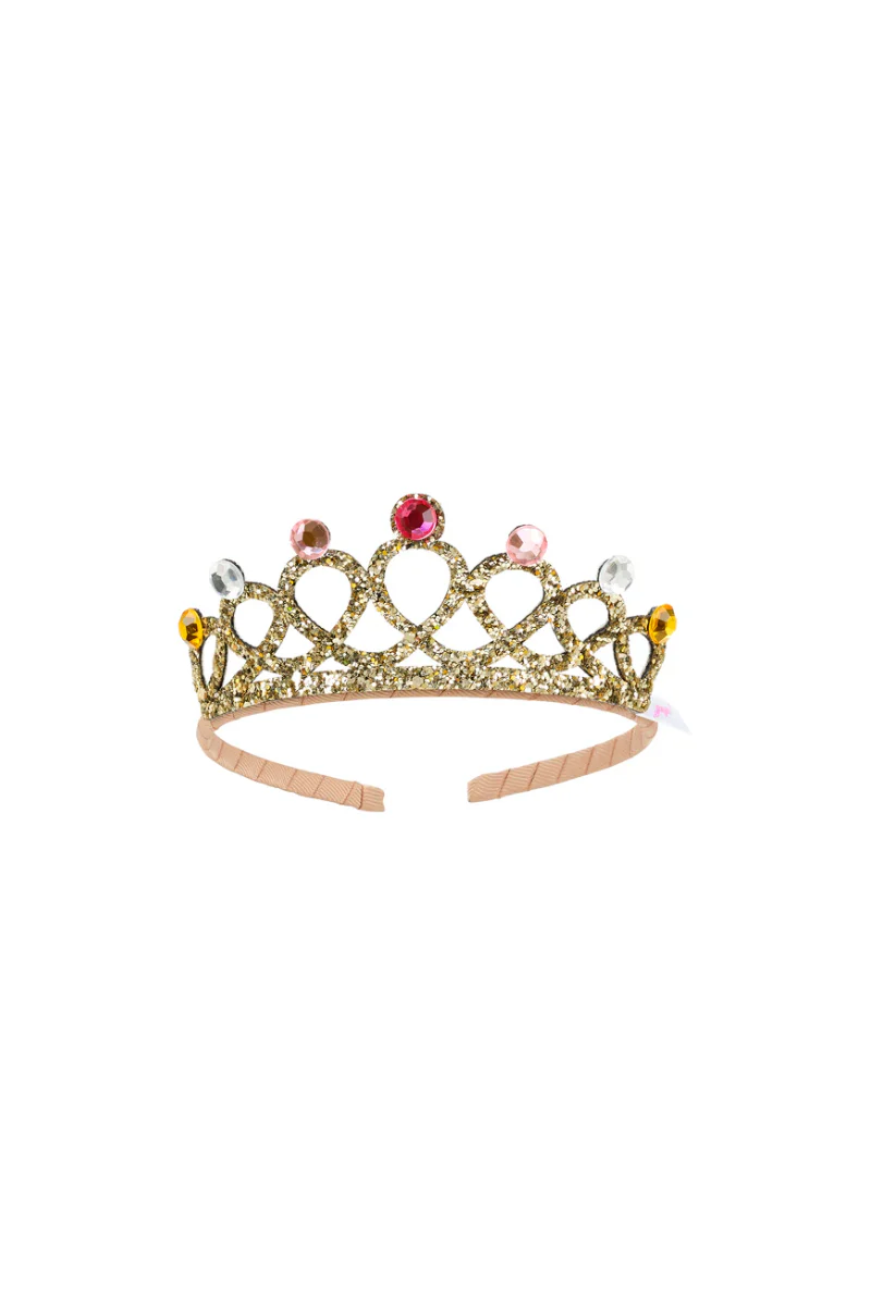 Cette couronne dorée « Emy » de Souza for Kids est ornée de paillettes dorées et de 7 pierres précieuses de différentes couleurs.