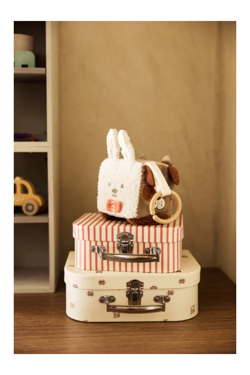 Le cube contient un cordon avec un anneau afin de facilement attacher le cube au parc ou au landau, par exemple.