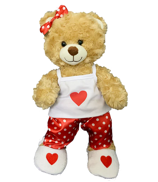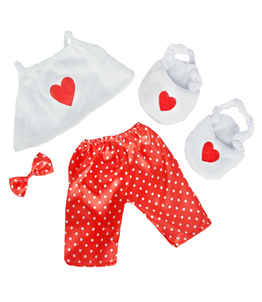 Ensemble avec motif cœur pour peluche 40 cm : débardeur, pantalon, pantoufles en satin et nœud. Pour de moments magiques et uniques, habillez votre peluche avec la tenue de votre choix parmi une large sélection de vêtements.