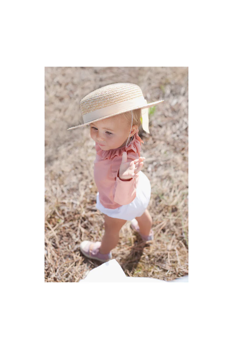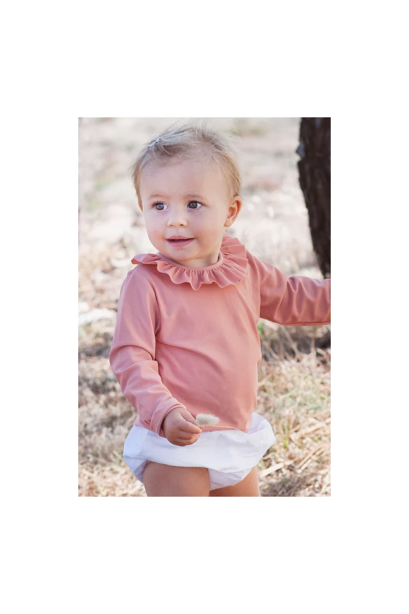 Le haut de maillot de bain Chloé rose imaginé par les Petits Dorés mêle élégance, protection et douceur. Son col volanté délicat, ses manches 3/4 et sa matière anti-UV en font une pièce aussi pratique que raffinée pour les journées ensoleillées.