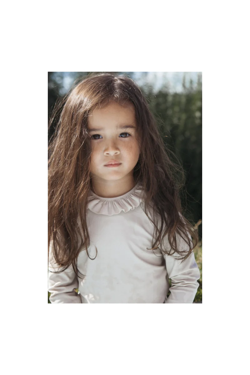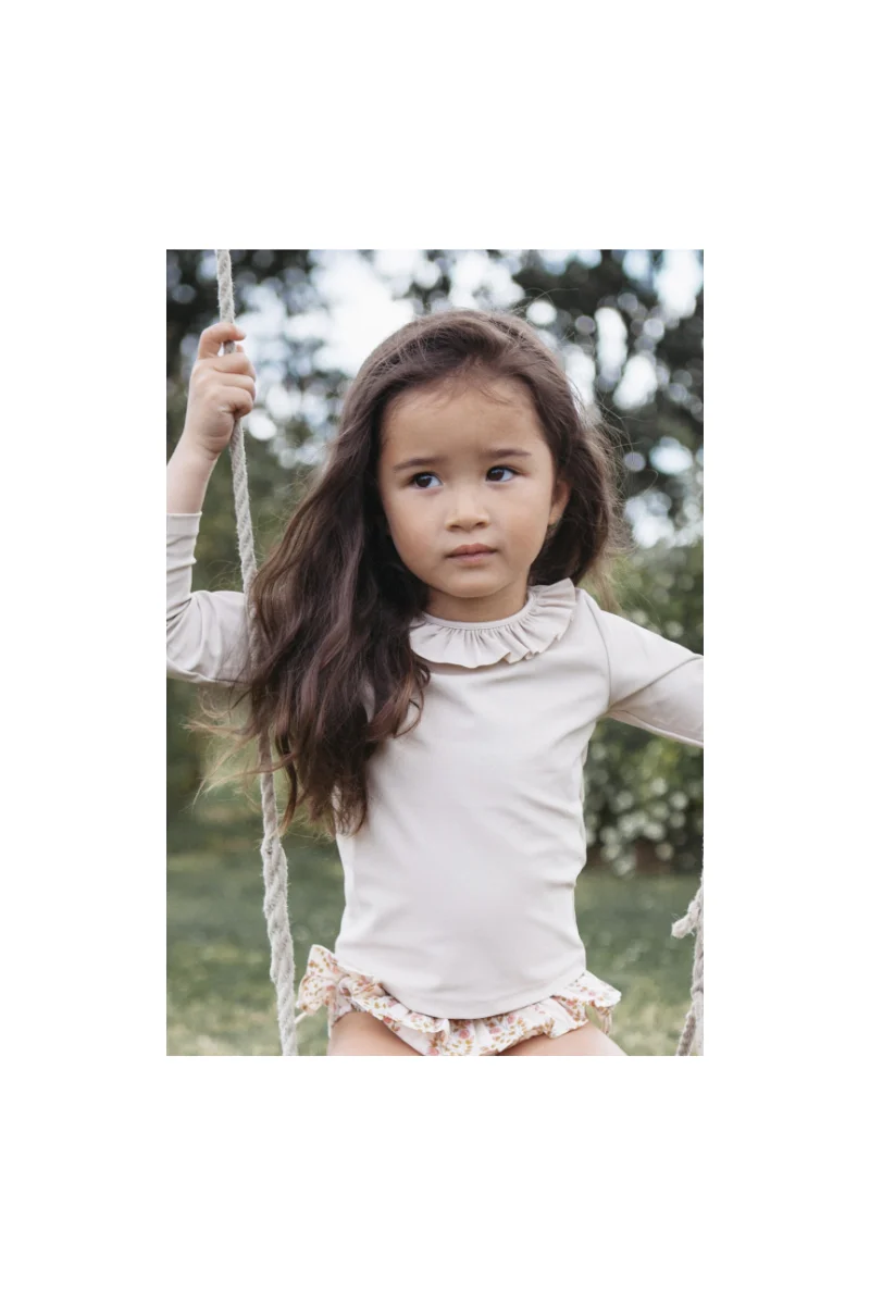 Le haut de maillot « Joe » écru protège avec style les petites épaules grâce à sa matière anti-UV. On aime son col à volants, délicatement froncé, qui apporte une touche élégante tout en restant pratique pour jouer, courir et se baigner .
