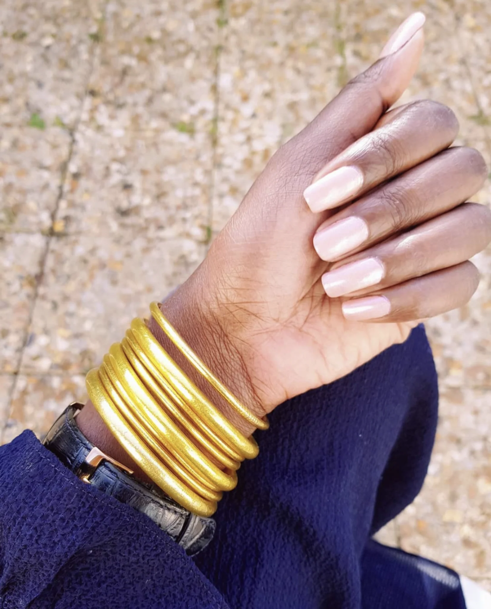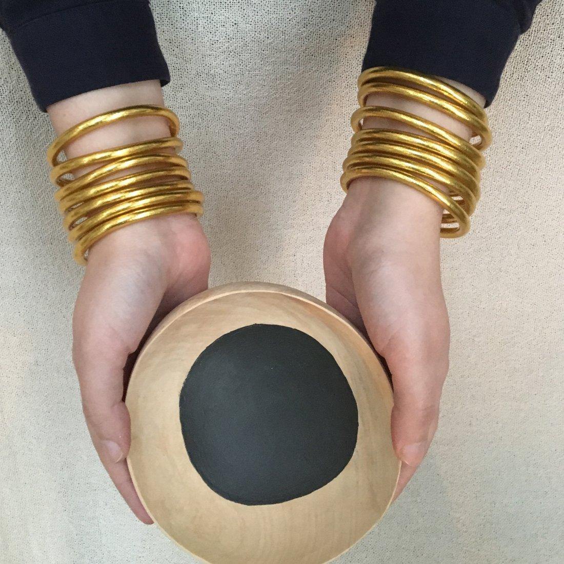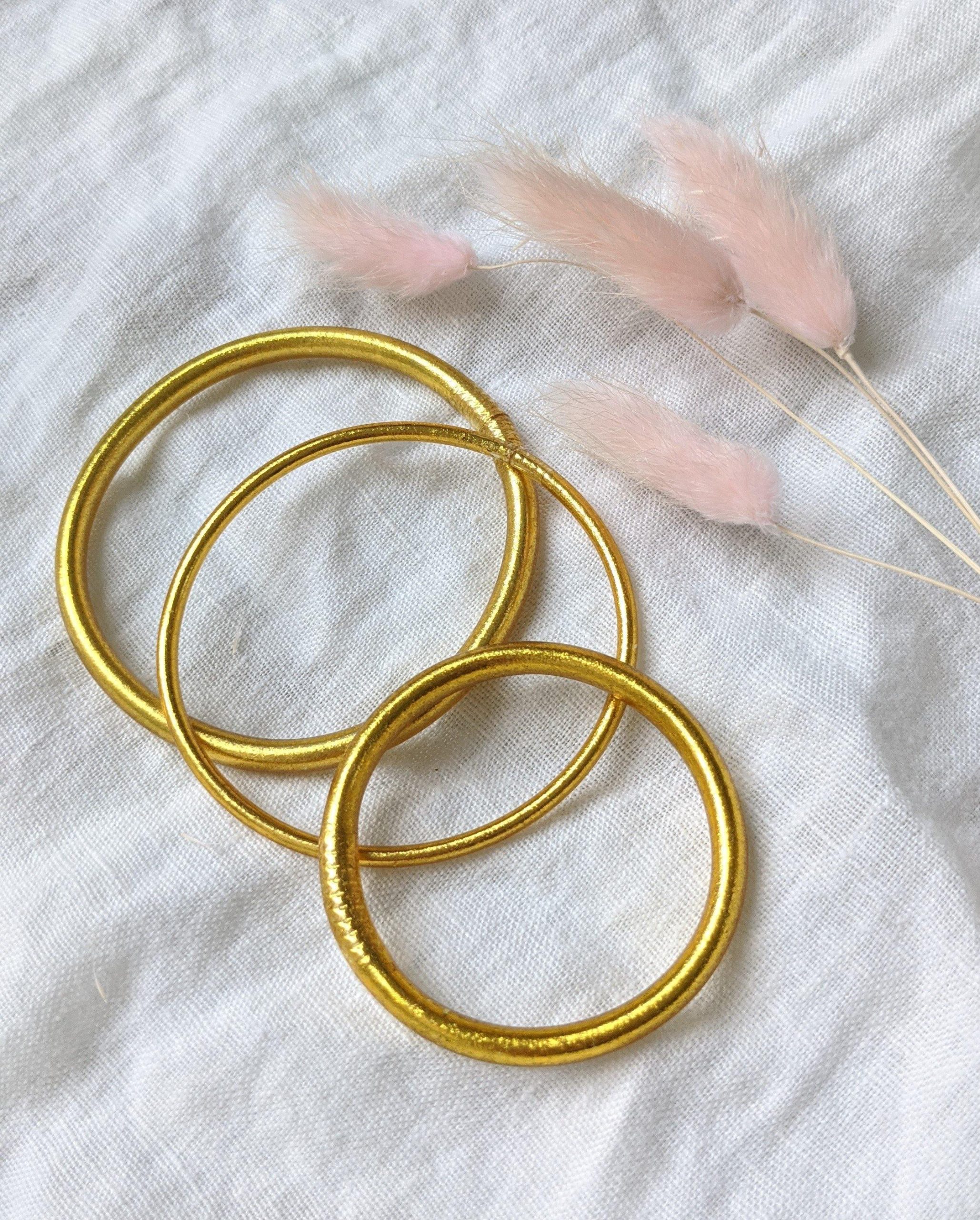 Bracelets joncs bouddhistes de la marque Baan, inspirés d’un modèle de jonc traditionnel porte-bonheur. Ils sont remplis de feuilles d’or utilisées pour le culte bouddhiste et bénis par les moines dans les temples.