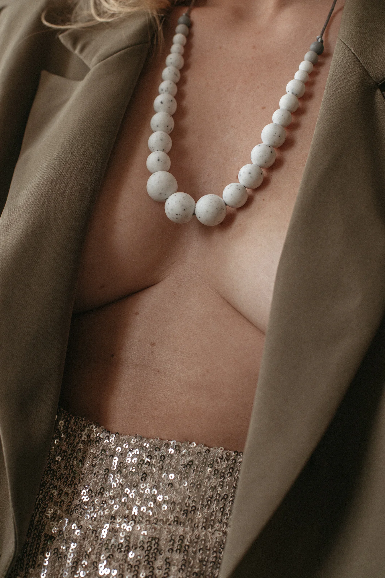 On aime ce bijou d’allaitement minéral, terrazzo granito lumineux en blanc et gris, inspiré des plages de galets de Myrtos sur l’île Grecque de Kefalonia.