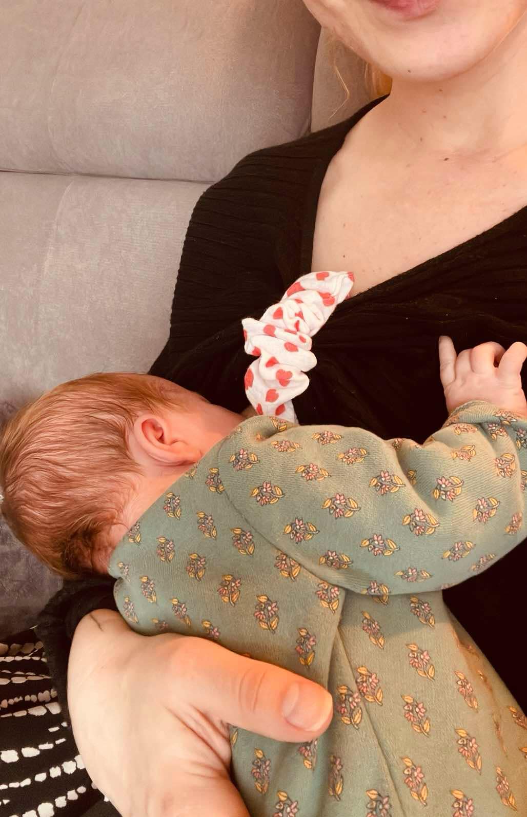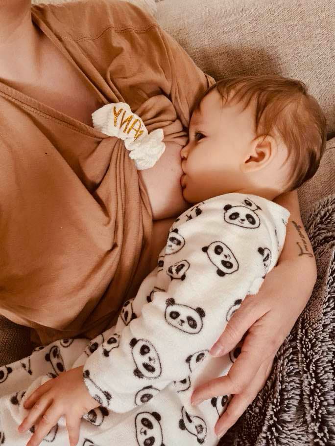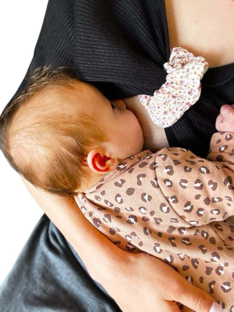 Accessoire d’allaitement malin et tendance, fait main en France : maintient vos vêtements pendant la tétée, puis se transforme en chouchou pour vos cheveux.
