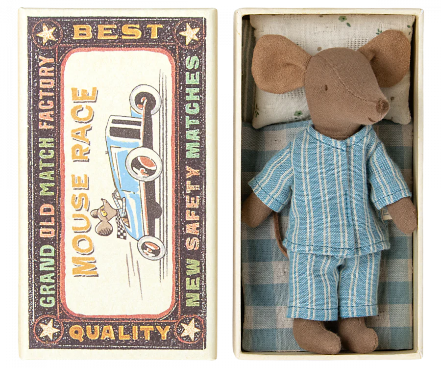 Un article classique de Maileg. Cette souris est prête pour des heures de jeu et dort bien dans la boîte d’allumettes. Les vêtements et le linge de lit sont disponibles dans des imprimés uniques et de belles couleurs.