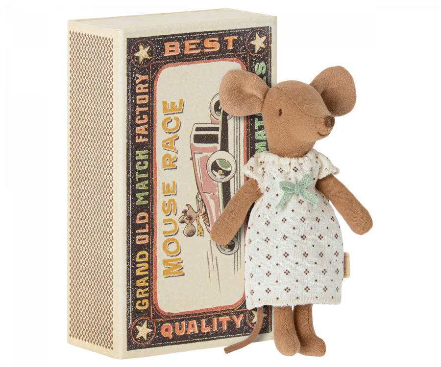Un article classique de Maileg. Cette souris est prête pour des heures de jeu et dort bien dans la boîte d’allumettes. Les vêtements et le linge de lit sont disponibles dans des imprimés uniques et de belles couleurs.