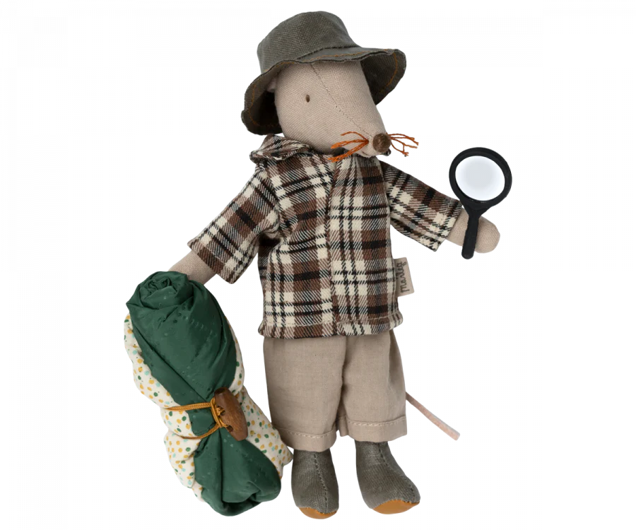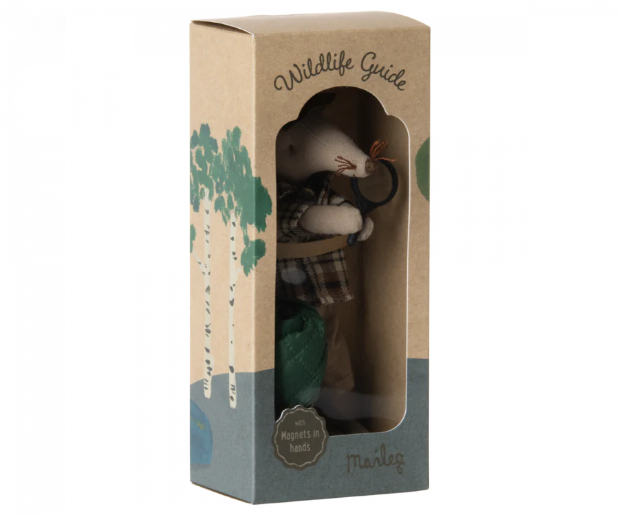 Cette souris guide de la faune est prête pour un voyage de randonnée. Le guide est habillé pour la marche et apporte un sac de couchage et une loupe pour explorer la nature. Ce modèle est de taille papa/maman et possède des aimants dans les mains.