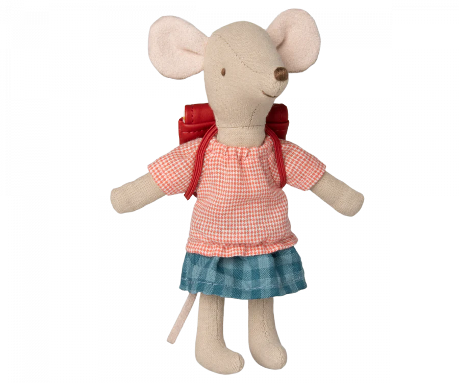 La grande sœur souris est habillée pour une journée au jardin d’enfants ou à l’école, portant son sac à dos sur le dos. Elle a des aimants dans les mains qui lui permettent de tenir les poignées du tricycle pour un voyage rapide.