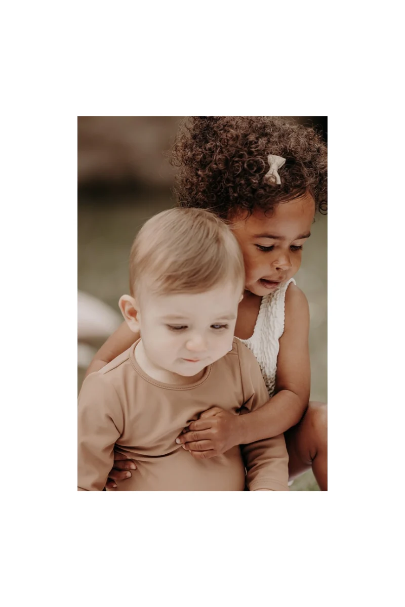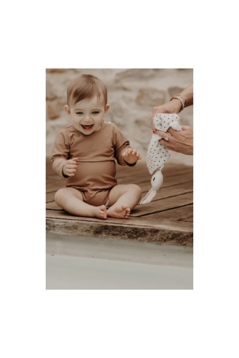 Maillot de bain anti-UV « Matelot » des Petits Dorés : une pièce à la fois pratique et élégante. Sa coupe ajustée et ses manches 3/4 protègent efficacement les tout-petits du soleil tout en leur offrant un confort optimal pour jouer, bouger et se baigner librement. On aime sa teinte marron chaude et naturelle, une couleur mixte et intemporelle, facile à accorder.