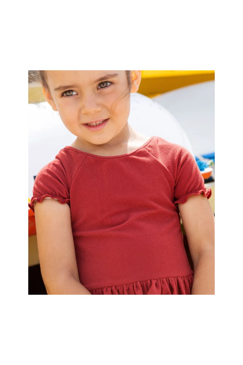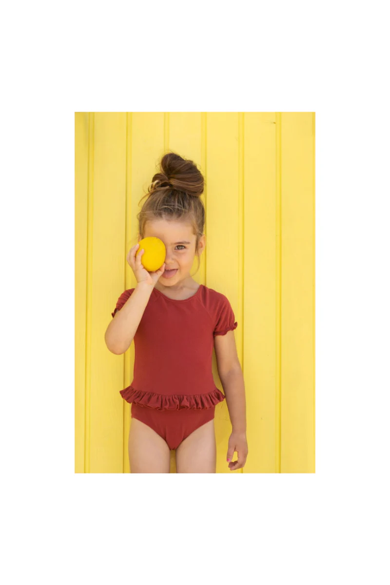 Confectionné dans une matière anti-UV effet éponge toute douce, il sèche rapidement et offre une bonne liberté de mouvement. Son coloris terracotta chaleureux et ses jolis volants au niveau des manches et de la taille ajoutent une touche de charme à ce modèle intemporel.