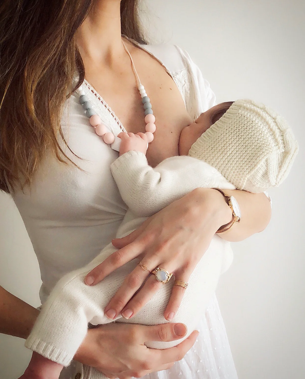 Placé autour de votre cou, ce collier en silicone accompagne vos doux moments. Et se créer une place dans la relation maman/bébé.