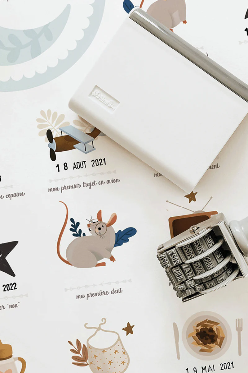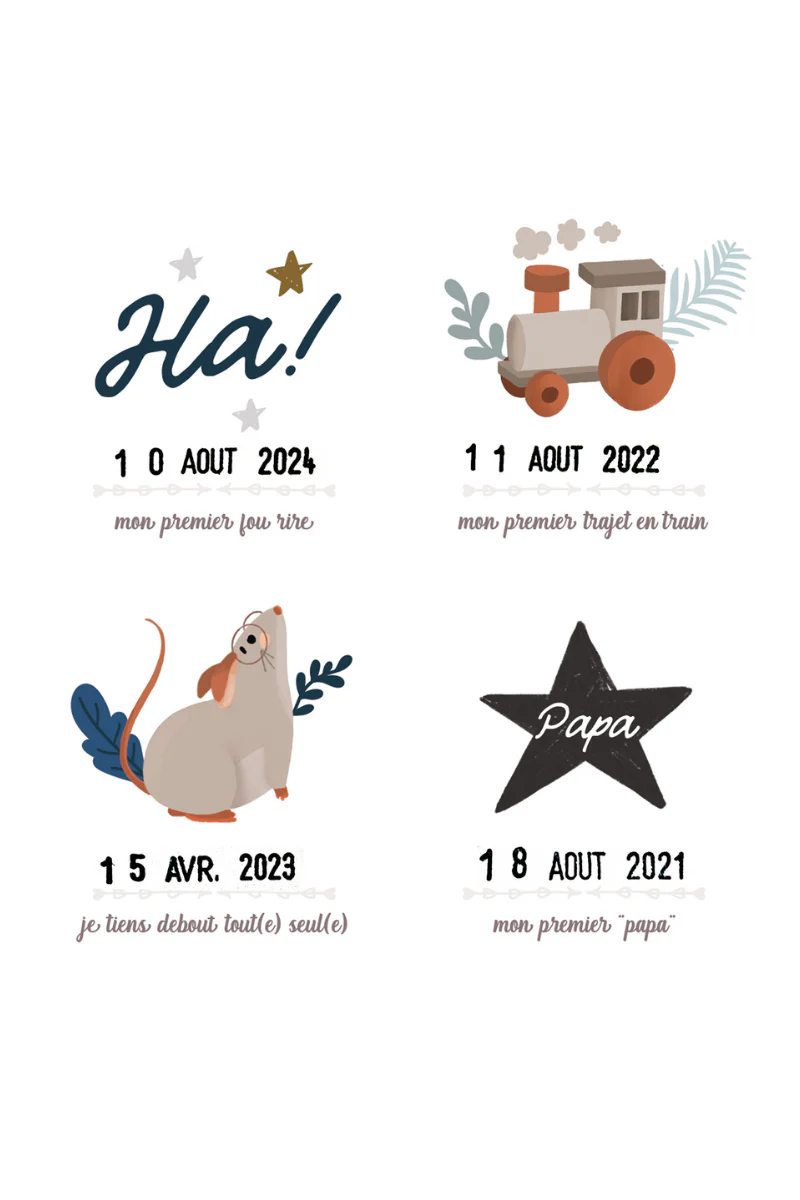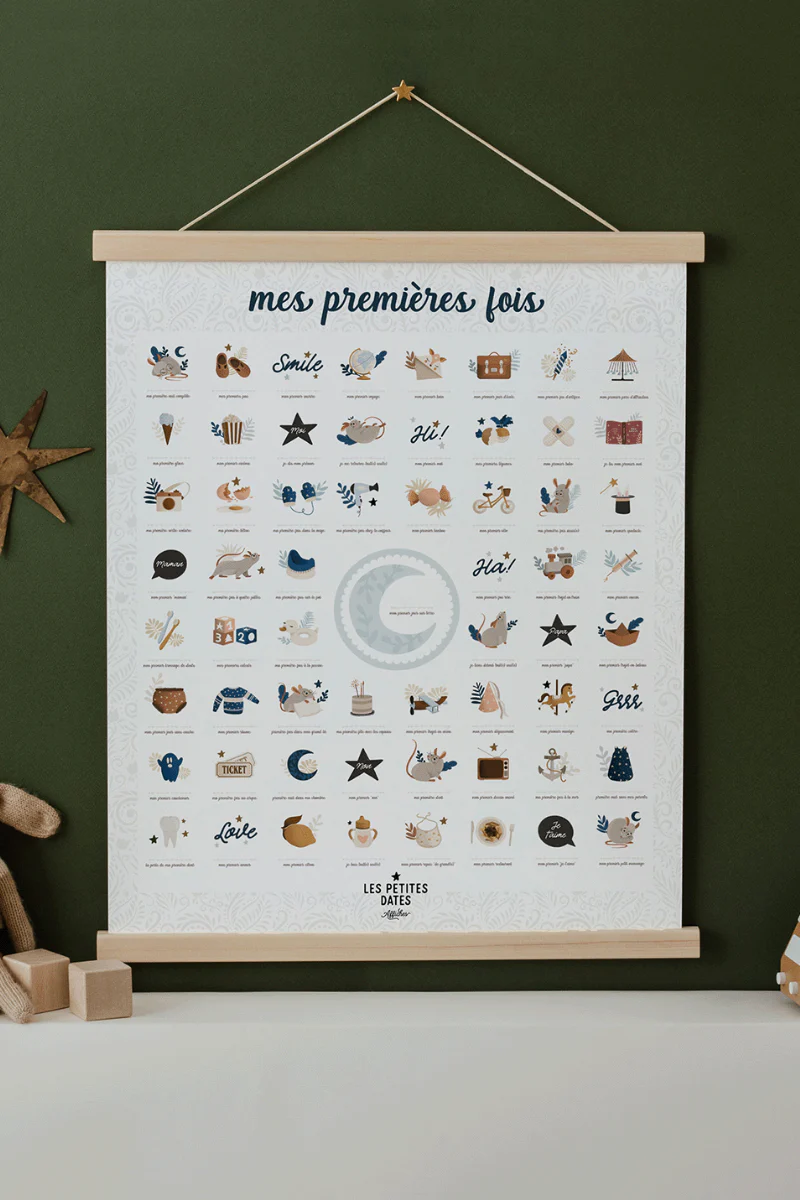 Il y les premières fois qu’on n’oublie pas comme les premiers pas, le premier mot… et il y a toutes les autres ! Qui se rappelle de la date de son premier bobo, de son premier brossage de dent, de sa première bêtise… ? Entre le « premier jour sur terre » et « mon premier trajet en avion »… L’affiche comprend 61 premières fois pour accompagner la vie d’un enfant de 0 à 7 ans ou plus !