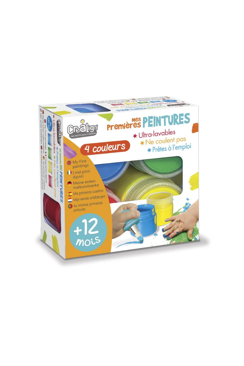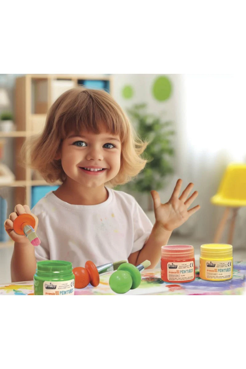 Il contient 4 pots de peinture prêtes à l’emploi, dans les couleurs rouge, verte, bleue et jaune. La texture est épaisse pour éviter les coulures, et chaque pot refermable se nettoie facilement à l’eau savonneuse. Une activité idéale pour stimuler l’imagination en toute liberté.