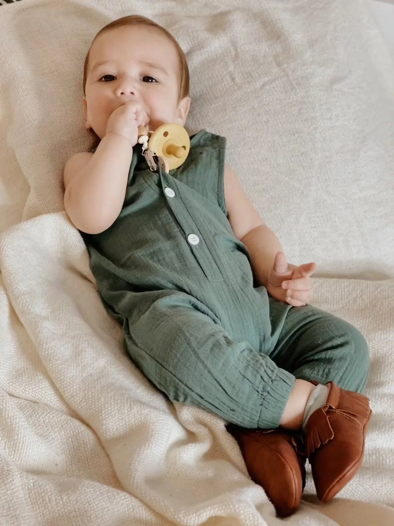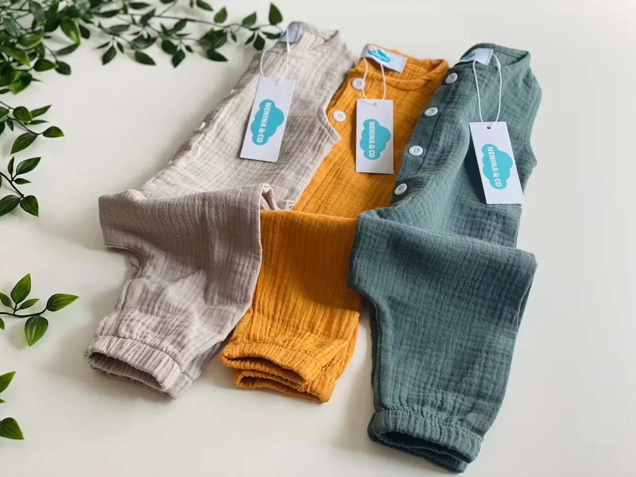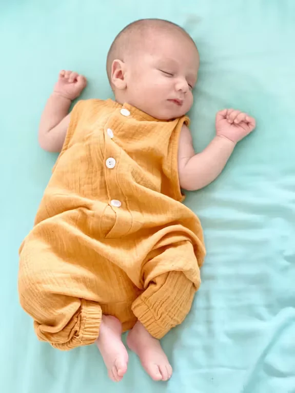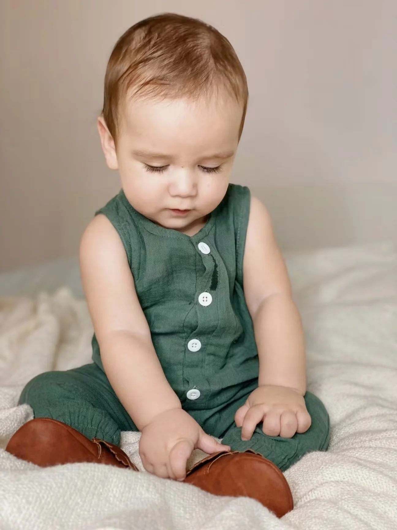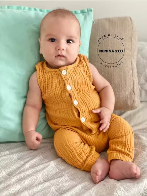 Salopette boutonnée en 100% mousseline douce de coton biologique dont votre bébé va adorer son confort.