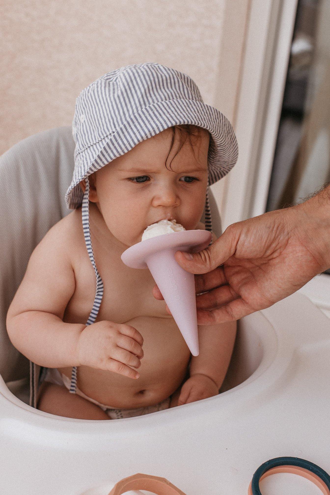 Dans cette idée de suivre les conseils de diversification menée par l’enfant en lui laissant du temps et de l’autonomie, nous avons décidé de vous proposer à nouveau pour cet été les silly cône en silicone pour accueillir les glaces qui normalement fondent sur la main avant d’être finie, ou qui atterrissent sur l’asphalte brulant avant même d’avoir été consommées.