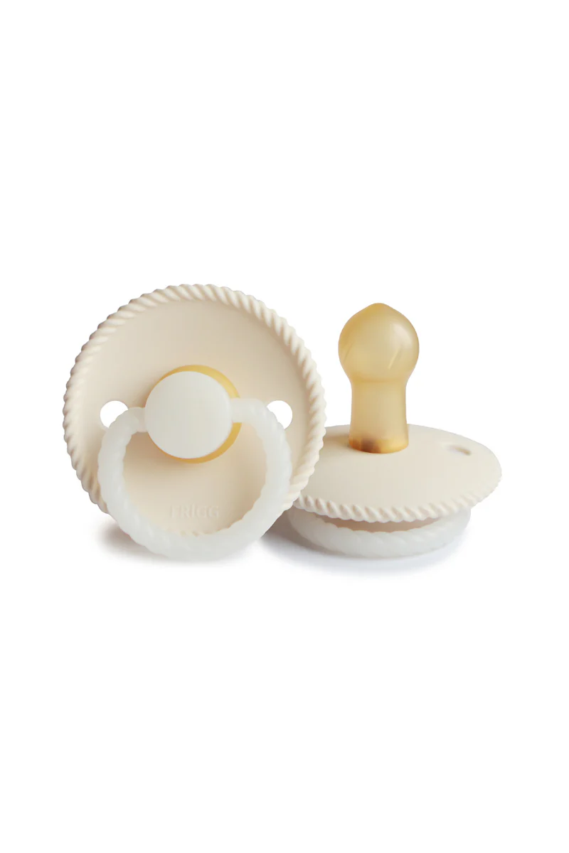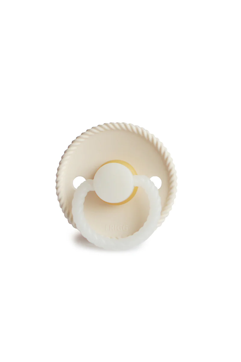 Adorable tétine au design minimaliste, la tétine Rope Night de la marque Frigg s’inspire des cordes et se décline en une multitude de coloris authentiques et délicats. Vous retrouverez l’effet torsadé sur le contour de la collerette et sur la poignée. Cette tétine night possède un anneau phosphorescent qui se voit dans l’obscurité. Idéal pour le bébé afin de retrouver sa tétine et pour les parents lors d’un réveil nocturne. La fonction phosphorescente est douce et non nocive pour les yeux de bébé.