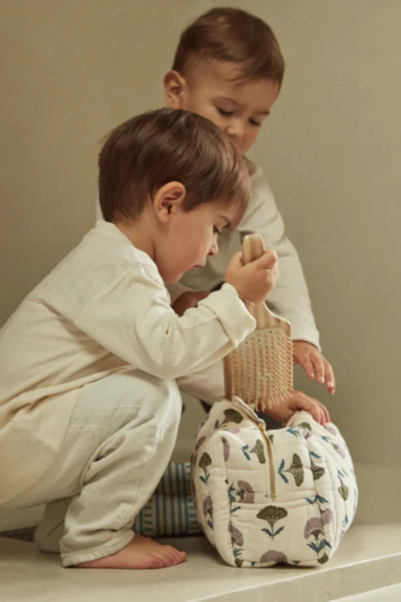 Adoptez cette trousse de toilette matelassée en double gaze de coton biologique ultra douce.