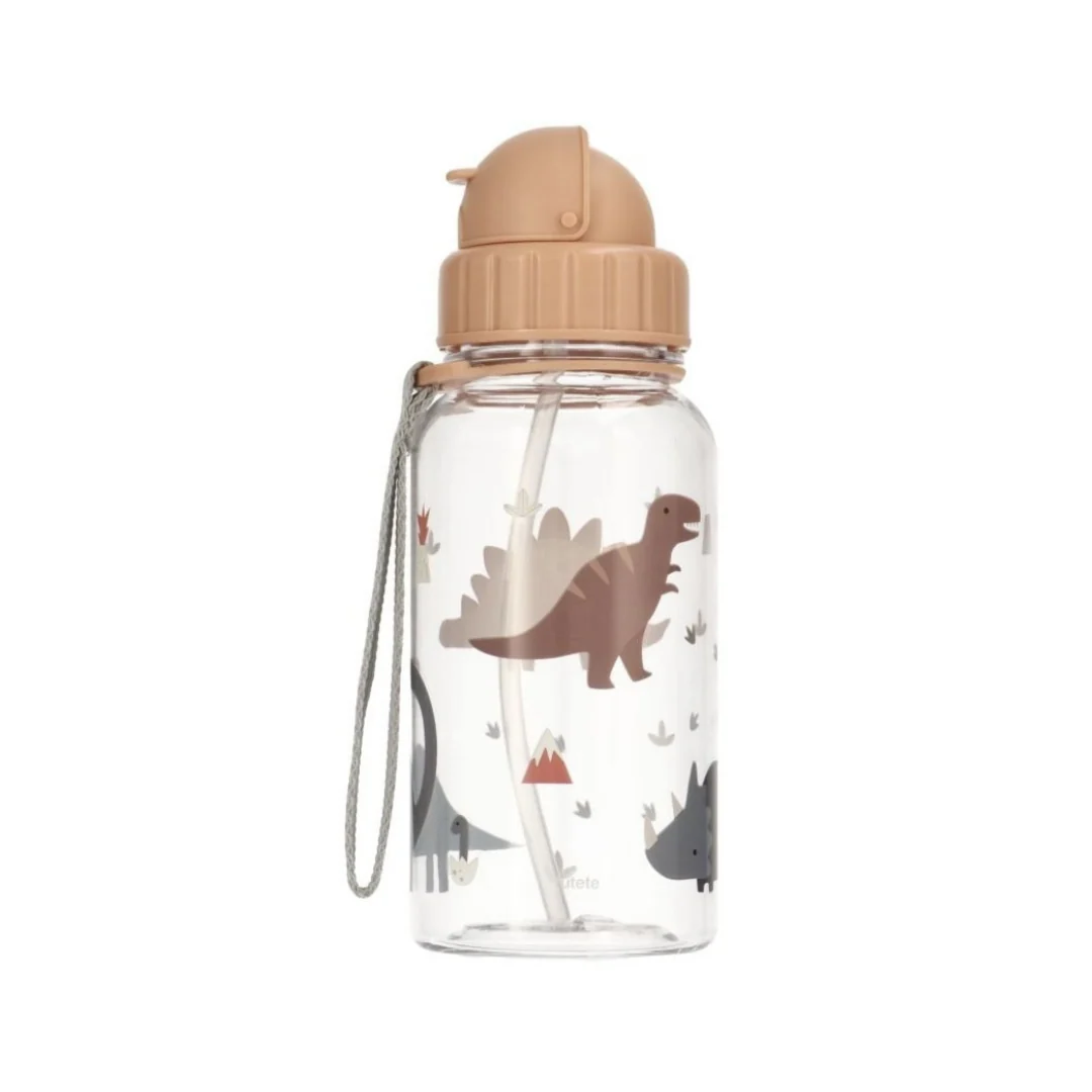 Gourde pour enfant en plastique Tritan de 500 ml légère, résistante et décorée de motifs amusants issus de la collection Dinos World de Tutete. Elle est dotée d’une paille rabattable en silicone qui se déplie automatiquement lorsque vous ouvrez son capuchon, idéal pour que les enfants puissent boire confortablement sans renverser d’eau.
