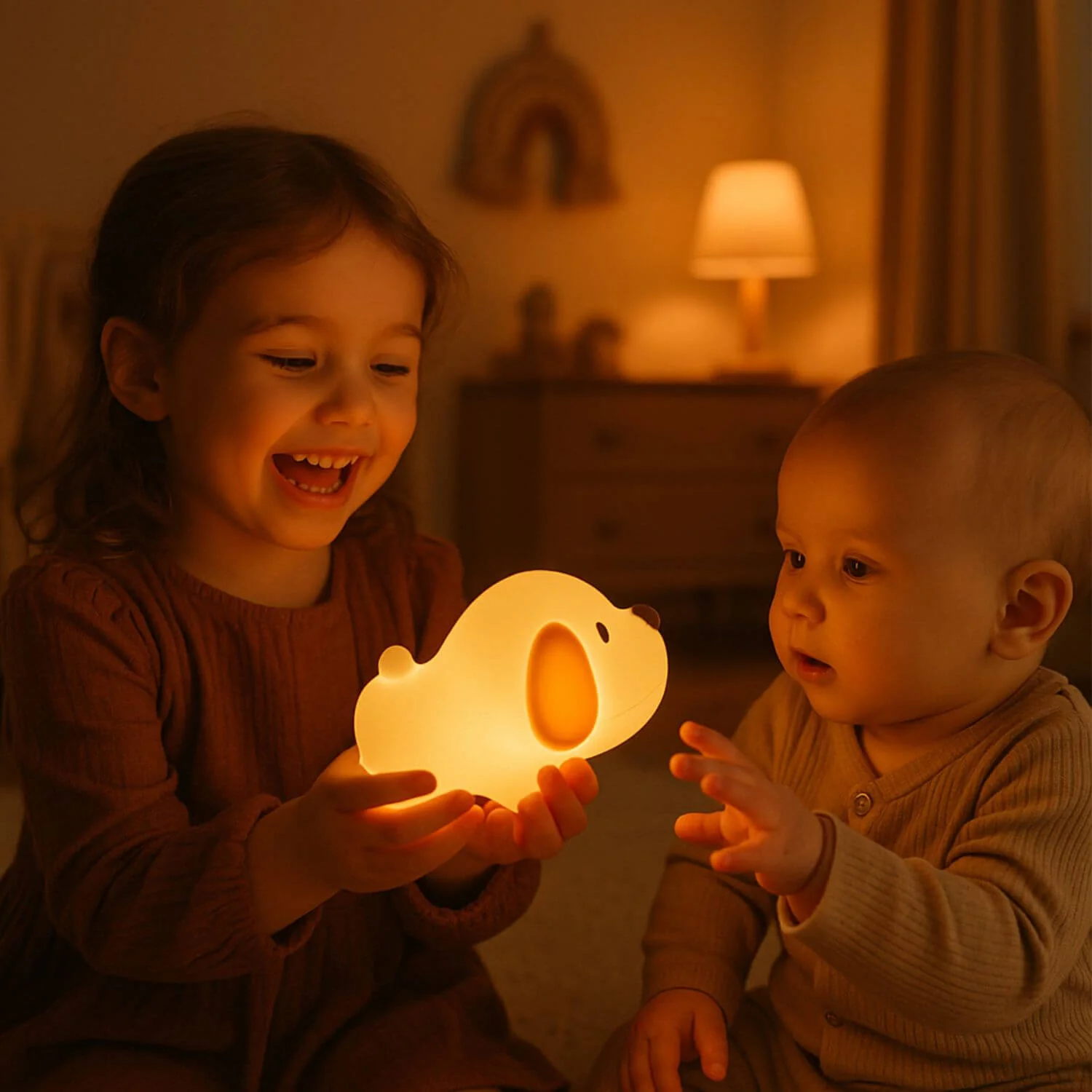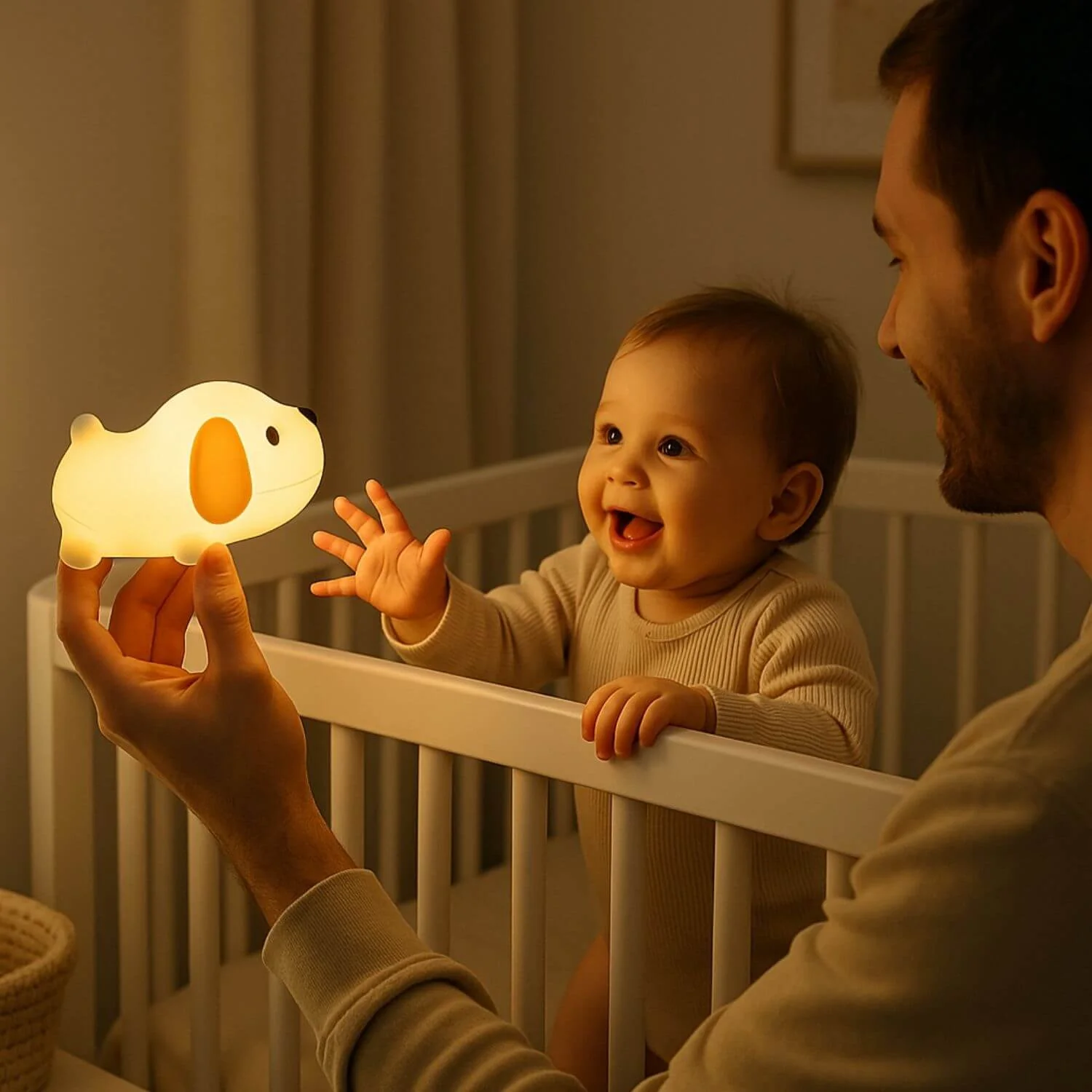 Ce compagnon lumineux en silicone flexible veille tendrement sur votre petit avec sa lumière douce et rassurante.